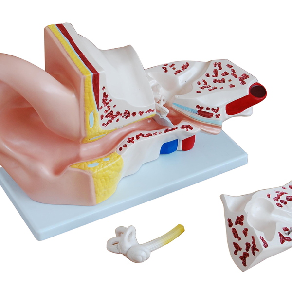 This model shows three main structural parts of the hearing organ (external ear, middle ear, internal ear) and the position of the equilibrium organ of human body. Dissectible into 4 parts, 5 times enlarged.