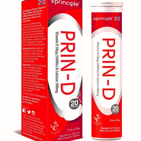 PRIN-D effervescent tablets are designed to dissolve in water to make a refreshing raspberry-flavored drink, ensuring faster absorption and faster onset of action. Each PRIN-D effervescent tablet contains 2000IU of Vitamin D3 and 500mg of Calcium. Sugar-free. No artificial colors or preservatives. Suitable for vegetarians.