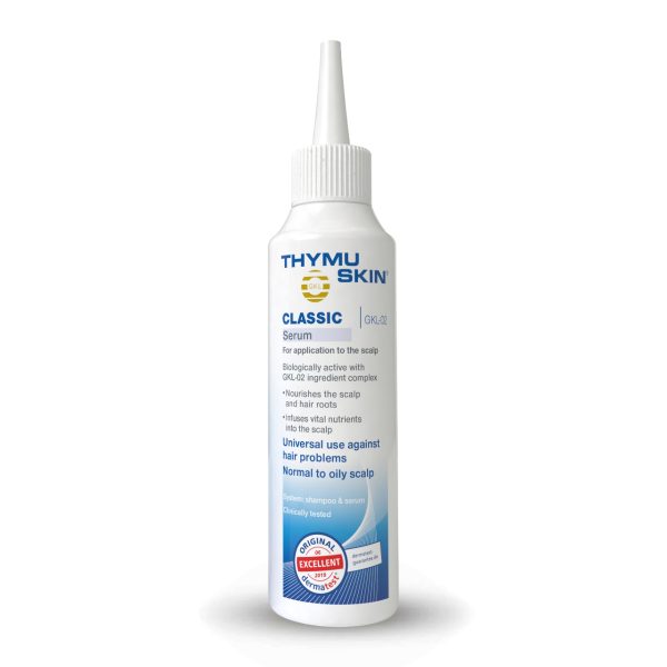 The THYMUSKIN® CLASSIC line is especially used for universal (all types and all stages) of Thinning hair problems. It also strengthens the immune defense and rejuvenates the hair follicle while also providing your hair with necessary hair caring ingredients. It contains the optimal dosage of the active and patented ingredient GKL-02. THYMUSKIN® CLASSIC is the version that was mainly used in the clinical studies.